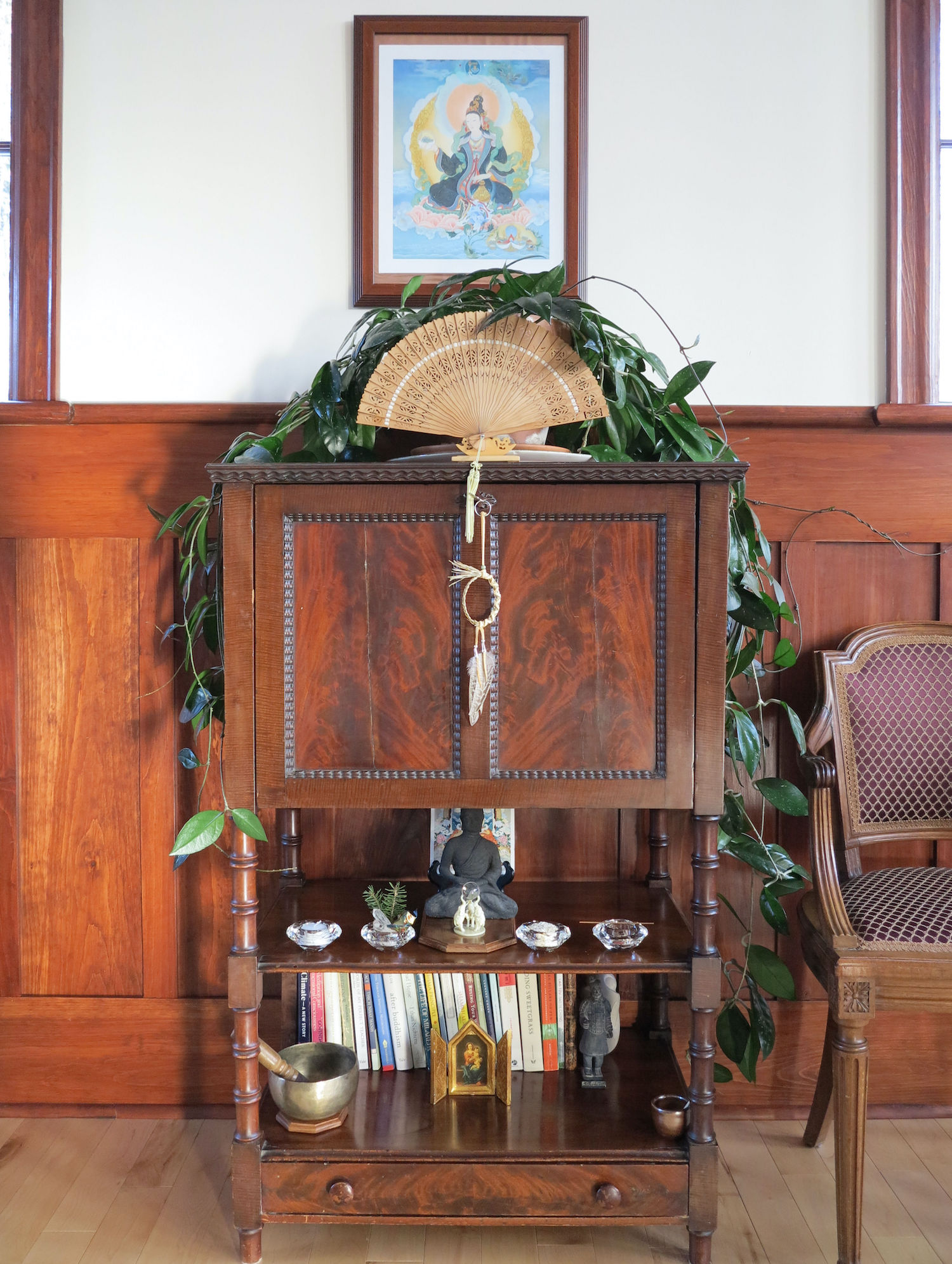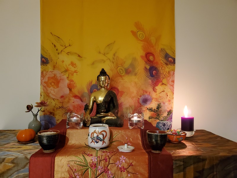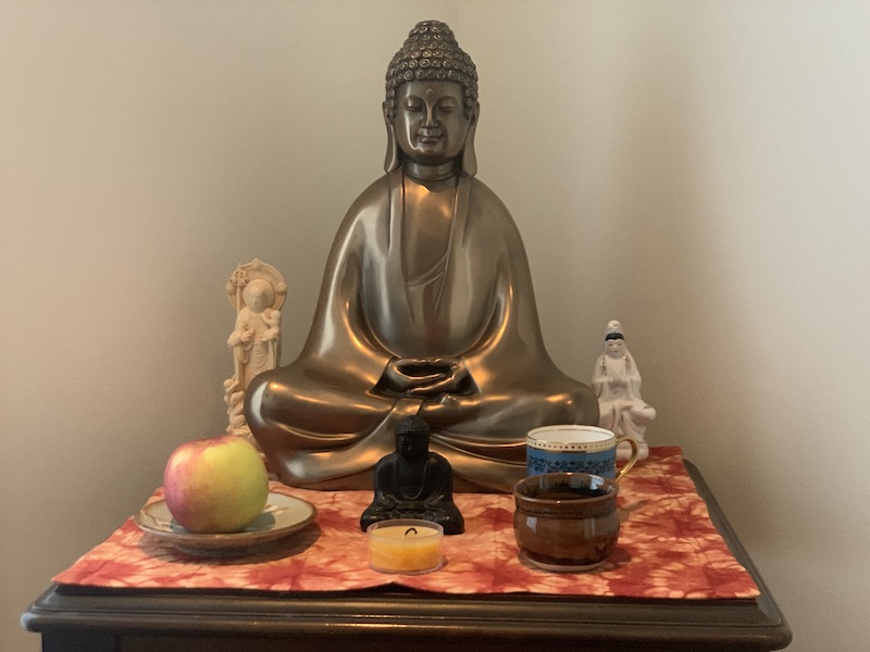 Next: Place a Buddha or Bodhisattva figure or a picture in your zendo. Adorn the altar (shelf or desktop) with incense and candles, a green living thing and fresh fruit and tea or water. Replace these as often as needed, tea needs to be changed every other day. An apple can often last more than a week whereas other fruit may not last. Grain and water also work as offerings.